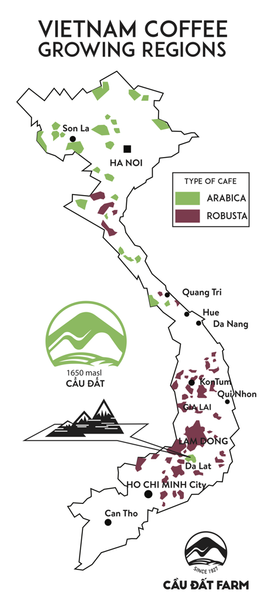 Một cây cà phê có thể mất tới năm năm để tạo ra quả và nó cũng không thể phát triển trong mọi khí hậu. Để có vụ một mùa bội thu, cây cà phê cần được chăm sóc đặc biệt với thành phần dinh dưỡng phong phú đến từ đất. Khí hậu nơi loại cây này có thể phát triển thường là khí hậu ấm áp của các vùng cận nhiệt đới và vùng xích đạo. Khi nhắc đến cà phê Việt Nam, không thể không nói đến dải đất Tây Nguyên, với các vùng trồng cà phê nổi tiếng như Cầu Đất, Đắk Lắk, Buôn Ma Thuật….và tỉnh Sơn La miền Bắc.